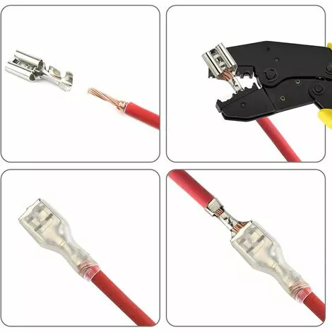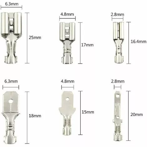 Spécifications : 6,3 mm de type : épaisseur : 0,4 mm pelle pelle (mâle), 0,8 mm (femelle), compatible Wire : 0,75–2,5 mm (AWG 18–14) 4,8 mm de type : épaisseur : 0,35 mm pelle pelle (mâle), 0,5 mm (femelle), compatible Wire : 0,75–2,5 mm2 (AWG 18–14) 2,8 mm de type : épaisseur : 0,25 mm pelle pelle (mâle), 0,5 mm (femelle), compatible Wire : 0,5–1,5 mm2 (AWG 22–16)
