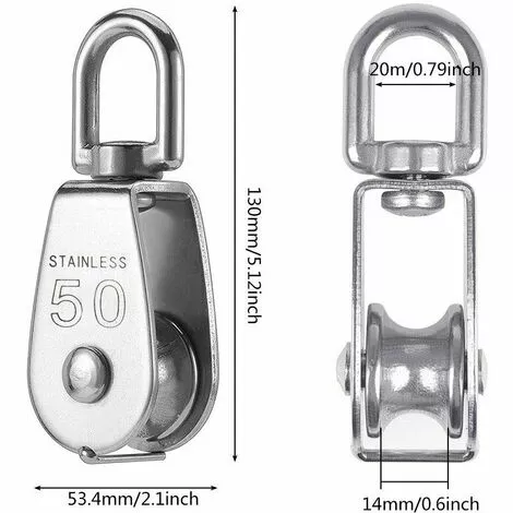 Anneau pivotant à 360 degrés — Poulie simple M50 avec roue tournante lisse, rotation à 360 degrés pour empêcher la corde/câble/fil de se nouer pour votre utilisation pratique. ), diamètre de l’œil : 20 mm/0,79 po, hauteur totale : 130 mm/5,12 po.