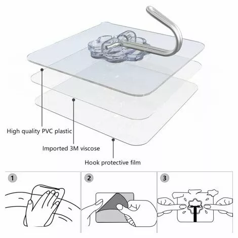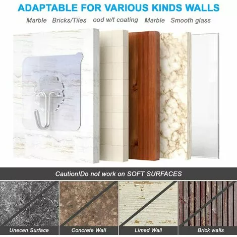 Facile à utiliser: décollez le film protecteur, nettoyez et séchez la surface lisse, appuyez fermement sur le crochet sur la surface et éliminez les bulles d’air en le touchant.