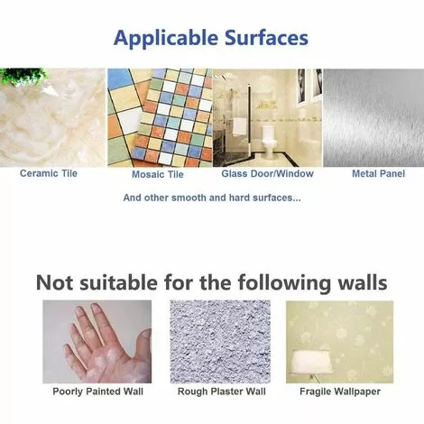 - Application large: Convient à toutes sortes de murs lisses, les carreaux, la céramique, le métal, le plastique, la surface en verre, etc. Ne convient pas au papier peint, à la peinture, aux murs peints et aux surfaces rugueuses.