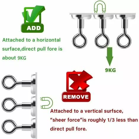 Pour atteindre une résistance à la traction jusqu’à 19,8 livres, l’aimant doit être fixé à une surface horizontale.