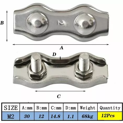 [Serre-câble en acier inoxydable] Le serre-câble double M2 est utilisé pour faire un anneau sur le câble métallique. Il se compose d’une base avec boulons et écrous. Il a des performances élevées et est largement utilisé. [Matériau durable] Le serre-câble en acier inoxydable est en acier inoxydable 304 de haute qualité, épais et durable, ne rouille pas, résiste à l’acide et à la corrosion, a une forte capacité portante et peut être utilisé pendant une longue période. [Finition fine] Le filetage du serre-câble a une haute précision et ne causera pas de glissement.La vis à double montant le rend plus solide et plus stable, éliminant les risques de sécurité cachés pendant l’utilisation. [Large application] Faciles à installer, à démonter et à réutiliser, les pinces à câble métallique peuvent être utilisées pour les câbles métalliques de 1,5 mm; les pinces duplex peuvent être utilisées pour fixer les cordes, les fils d’acier, les cordes à linge, etc. [Spécifications du produit] Le kit de pinces à paire torsadée M2 contient 18 pinces à câble en acier, d’une longueur de 3 cm et d’une épaisseur de 0,1 cm. Il est facile à utiliser et convient aux câbles en acier de 1 mm à 1,5 mm. La pince à paire torsadée est nécessaire pour le gréement et les câbles lourds annexe.Caractéristiques: