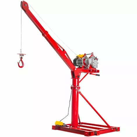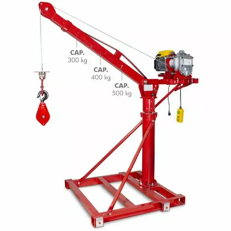 Caractéristiques : Palan 230 V 2,3 kW, avec fiche et console de commande Capacité 500 kg Levage et descente en charge Bras télescopique en 3 longueurs et 3 hauteurs, pour atteindre de longues distances ou hisser de grands objets Base orientable à 360° avec verrouillage et poignée Boîte de vitesse robuste avec transmission fixe (rapport 95:1) Frein électromagnétique sur le moteur Se compose de : Palan avec câble en acier de 25 m de longueur et 6 mm de diamètre, avec crochet Base large et stable, avec trous pour placer des tubes en acier (non fournis) La base et les tubes sont alors lestés avec des sacs de sable ou des blocs de béton (non fournis) pour stabiliser la grue Télécommande avec double condensateur, assurant un démarrage en douceur du moteur et le levage de charges à pleine capacité.