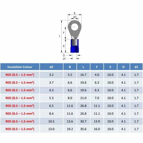 100 pièces de cosses à sertir rouges isolées de PVC de 3,7 mm. Connecteurs annulaires à fil rouge adaptés aux tailles de fil de 0,5 à 1,5 mm2. Les cosses à anneau isolées sont fabriquées d’une seule pièce, offrant un excellent rapport qualité-prix et une connexion fiable.