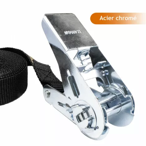 La sangle est réalisée en polyester et a une excellente robustesse à l’abrasion et aux U.V, associée à à un tendeur à cliquer en acier chromé, la sangle à cliquet a ainsi une haute résistance et une durabilité maximale dans le temps.
