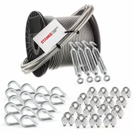 - Notre gamme comprend également d’autres sets de câbles métalliques de différents diam?tres et constructions, ainsi que les accessoires appropriés tels que des serre-câbles, des cosses, des tendeurs, des crochets et bien d’autres produits.