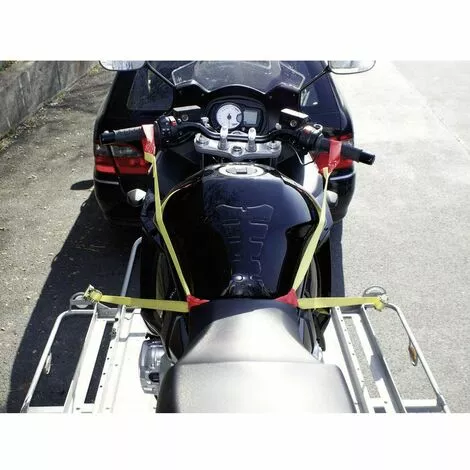 Set de sangles et de tendeurs. Idéal pour transporter une moto. Les passants intégrés sont à accrocher aux extrémités du guidon, puis les sangles sont tendues grâce au deux cliquets, en passant par la housse du réservoir. Une sangle avec fermeture à attache est incluse pour la roue arrière.