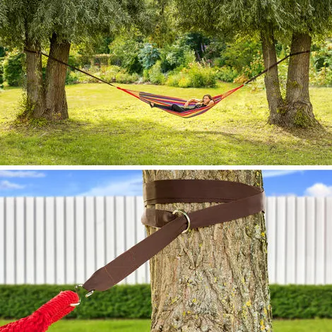 Kit de fixation pour hamac, Sangles de fixation universelles pour hamac, Attaches 320 cm sur arbre – Charge maxi 200 kg – Marron TECTAKE. Grâce au kit de sangles de fixation TECTAKE, vous pourrez accrocher votre hamac en toute sécurité dans un endroit calme entre deux arbres. La sangle permet, grâce à sa grande stabilité, un accrochage solide et respectueux des arbres.