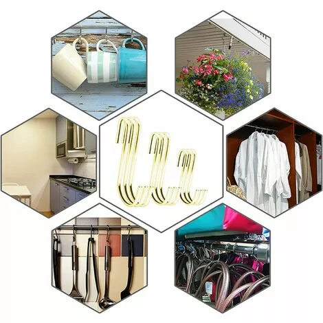 - Nos crochets en S robustes sont une solution de rangement simple et brillante pour accrocher tout ce qui se trouve dans votre cuisine, placard, atelier ou garage où l’espace est limité. Il suffit de les accrocher sur un support de casseroles, des rails muraux ou des étagères.